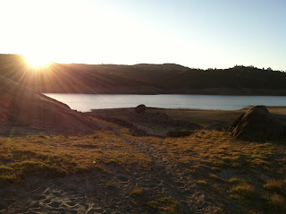 One thing I wanted to do this summer was ride to Folsom Lake and see the sun rise up over the hills. Last Wednesday I got to do just that. My friend rode Sky and I took Zoe. We met at 6 am and I wanted to go out the gate at 6:30 but we ended up going out at 6:40. It worked out because we mostly trotted to the lake. We got down there and about 1 minute later the sun came up. Totally worth it. The shadows and the light was awesome, so different from later in the day. We took our time on the ride and stopped to take many pictures. The pictures don't do it justice-you'd have to be there. I expected to see some wildlife but the only thing we saw were geese and for a while we were herding them. And on the way back we did see a very large pile of bear scat, not sure how old it was but it wasn't fresh. (I saw it again the next day and it seemed smaller, I guess the heat must have dried it up some-maybe it was fresher than I thought) The horses did great on the ride. They weren't spooky at all. The only thing they "got away with" was eating grass while we stopped to take pictures.